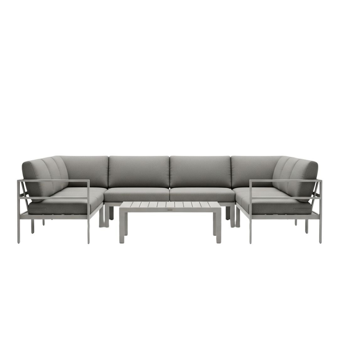 Set bestehend aus 3 Eckmodulen, 2 Mittelmodulen, 1 Hocker/Tischmodul, inklusive aller Sitz- und Rückenkissen.