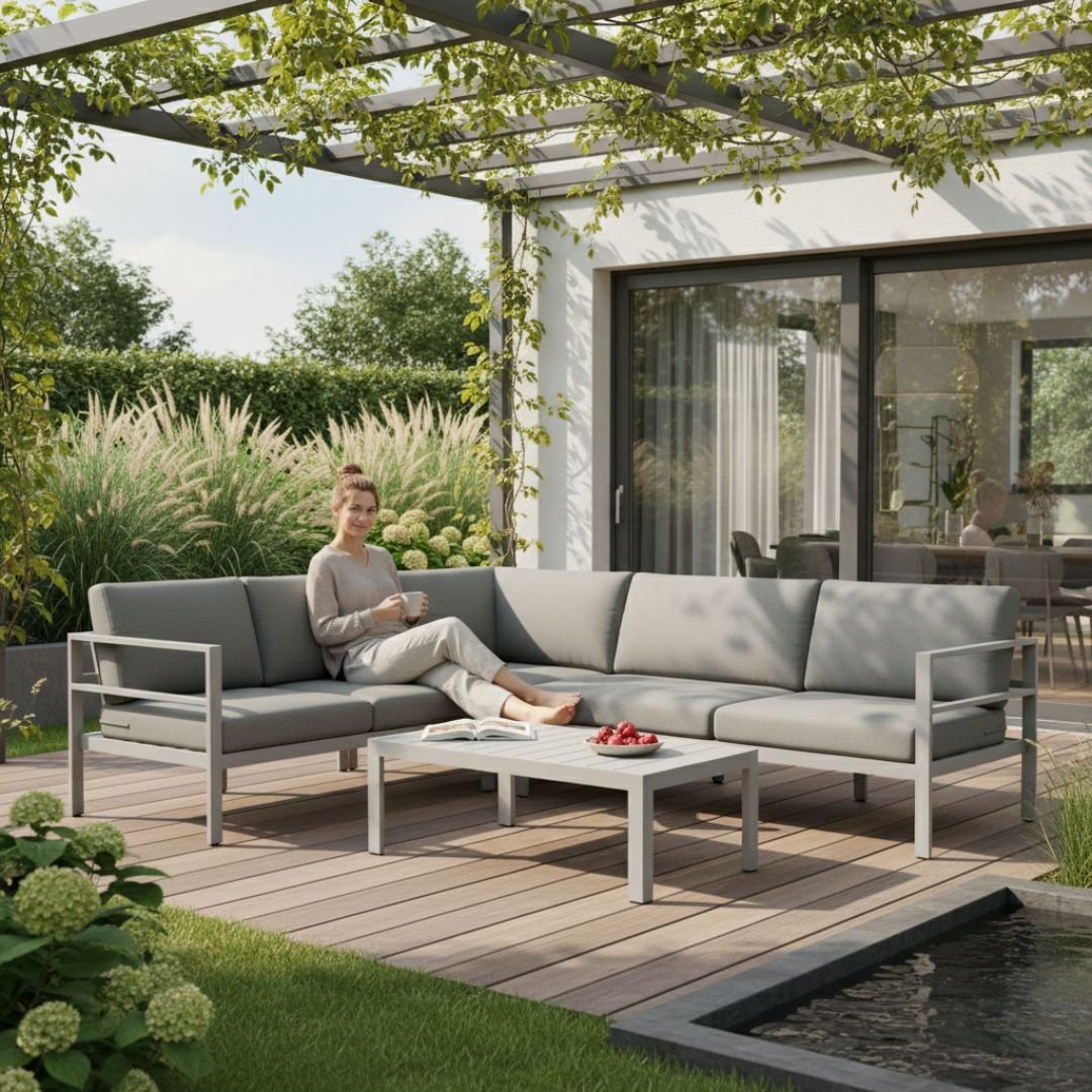 Wetterfeste Materialien: Robuster Aluminiumrahmen und UV-beständige Polster.